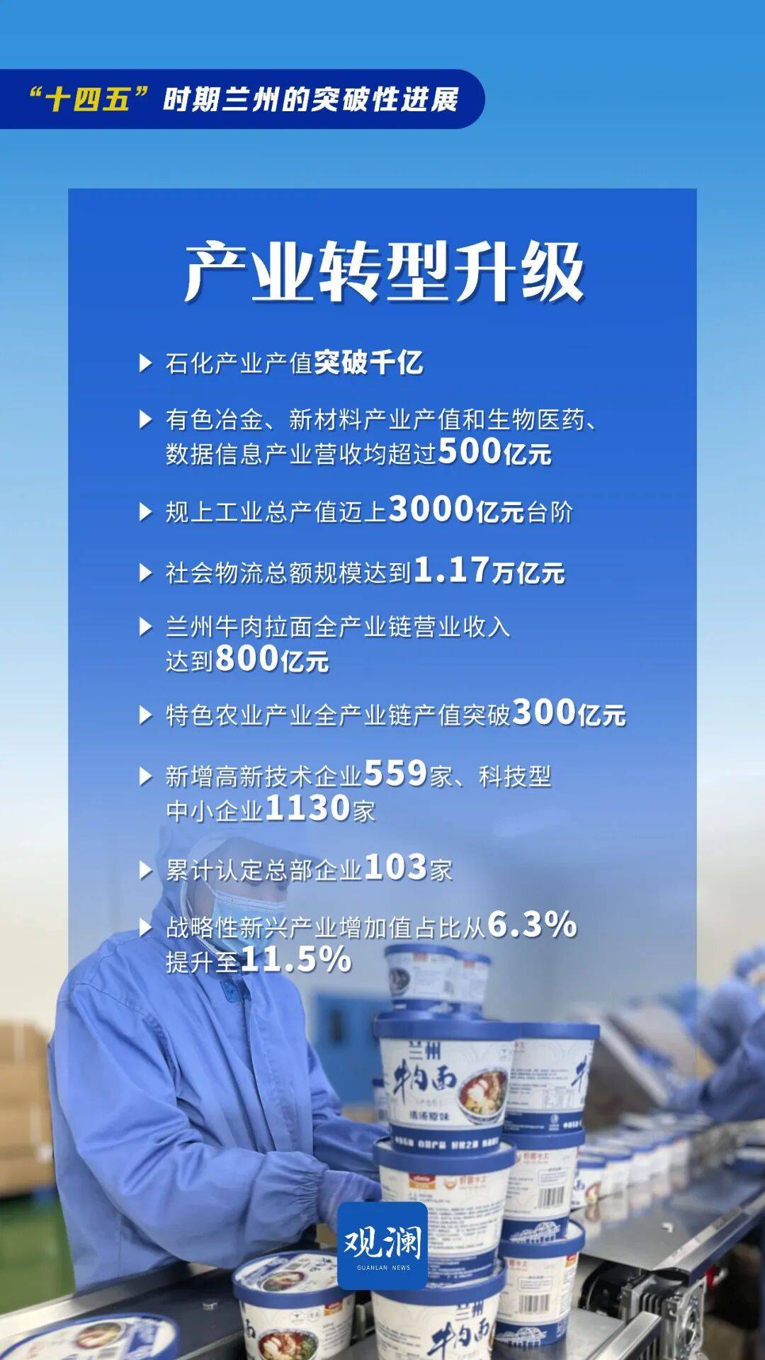 产业转型升级取得突破性进展:因地制宜构建“3+2”现代化产业体系,石化产业产值突破千亿,有色冶金、新材料产业产值和生物医药、数据信息产业营收均超过500亿元,规上工业总产值迈上3000亿元台阶,对全省的贡献率第一。社会物流总额年均增长5.2%,规模达到1.17万亿元,兰州牛肉拉面全国门店超过7万家,全产业链营业收入达到800亿元。特色农业产业全产业链产值突破300亿元。新增高新技术企业559家、科技型中小企业1130家,年均分别增长13.2%和29.9%。累计认定总部企业103家。战略性新兴产业增加值占比从6.3%提升至11.5%。